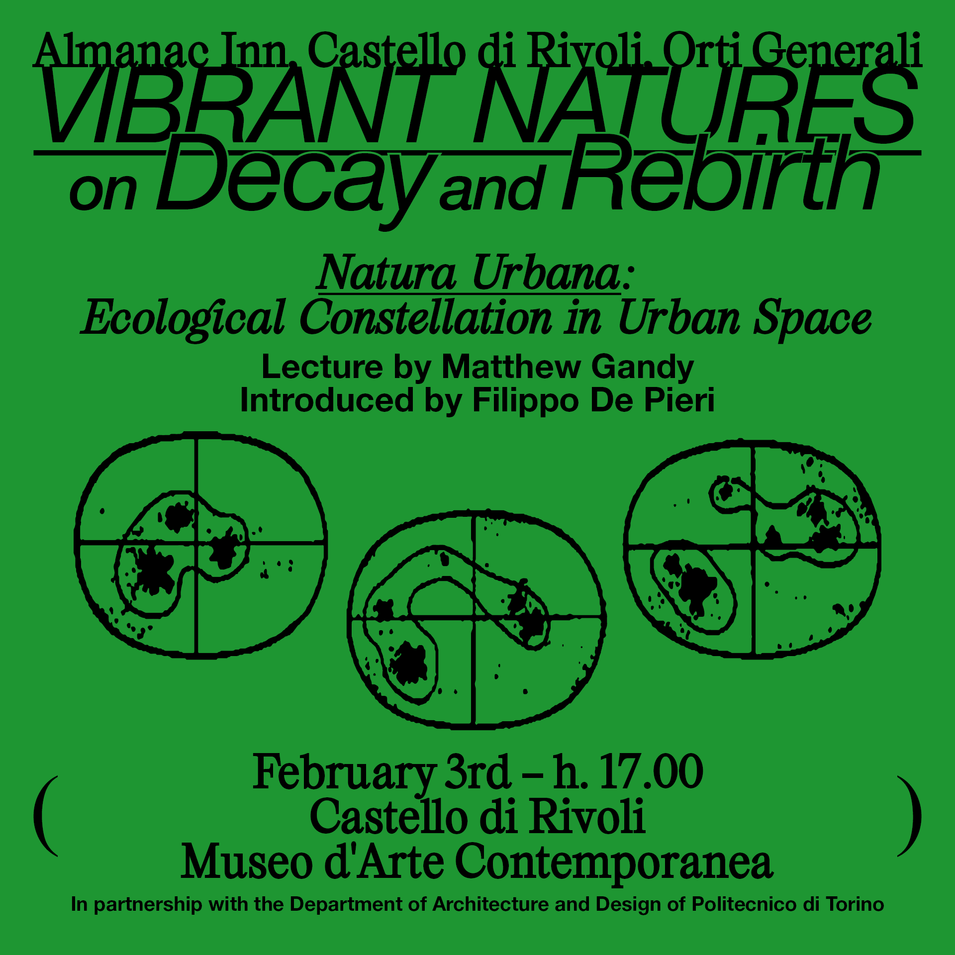 Natura Urbana: Ecological Constellation in Urban Space is the first event of Vibrant Natures. On Decay and Rebirth. Introduced by Filippo De Pieri, Professor of Architectural History at the Department of Architecture and Design, Politecnico di Torino. The event is presented in collaboration with the Department of Architecture and Design of Politecnico di Torino. The event will be in english.