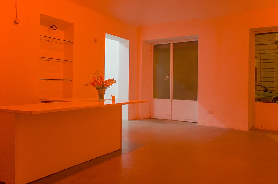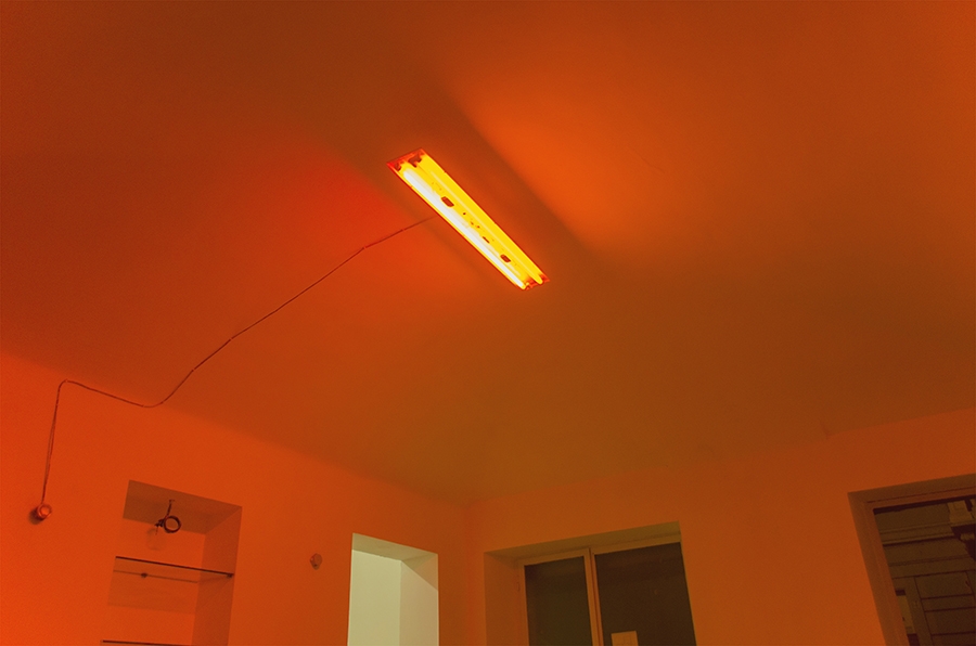 The exhibition is like a Sun salutation, a light stretching. In what might be the foyer, misplaced light effects and an ambiguous monologue bend forward to greet us.