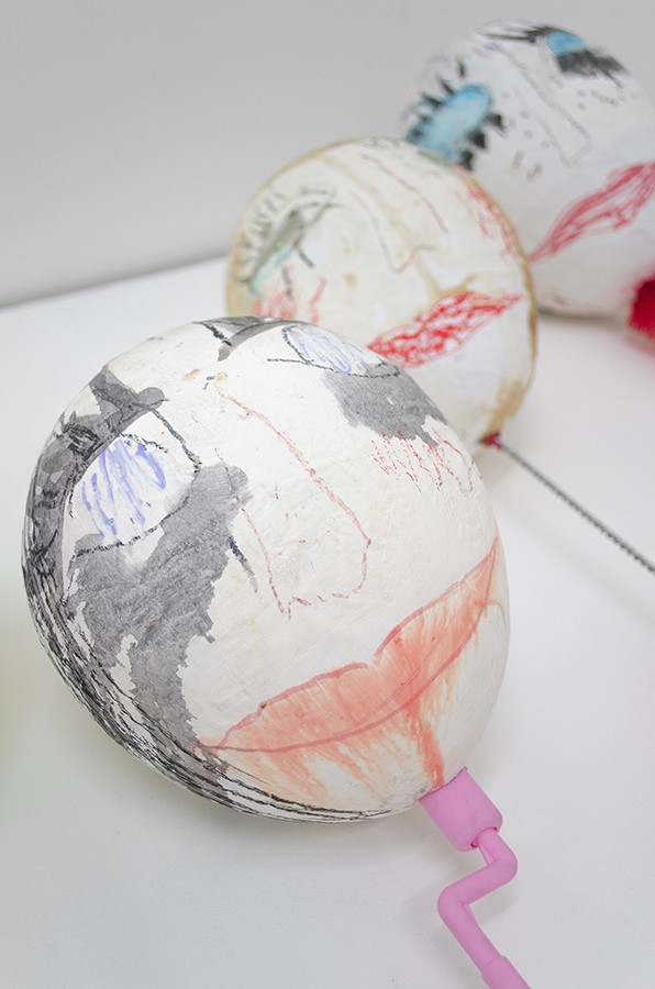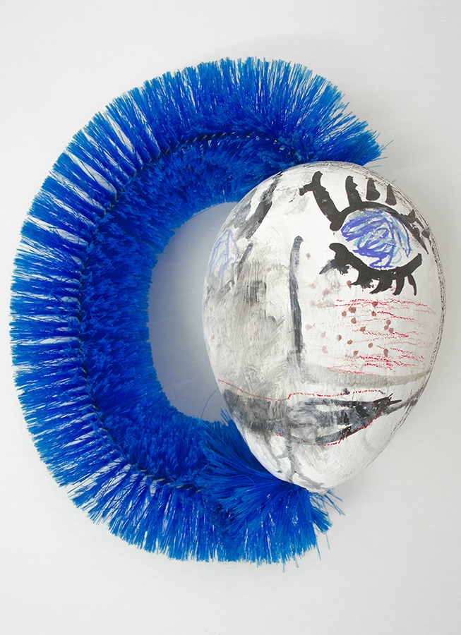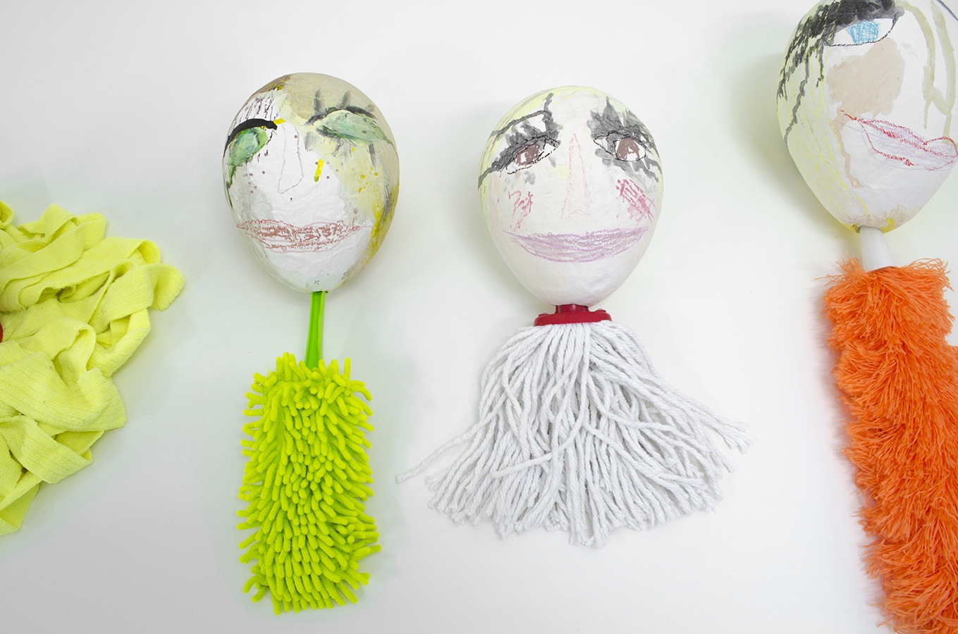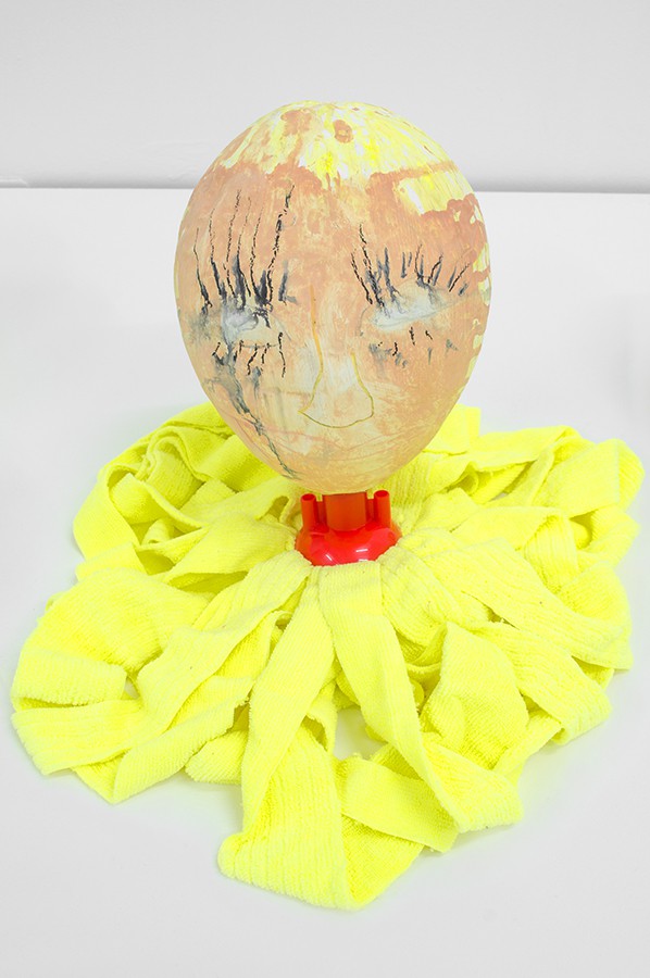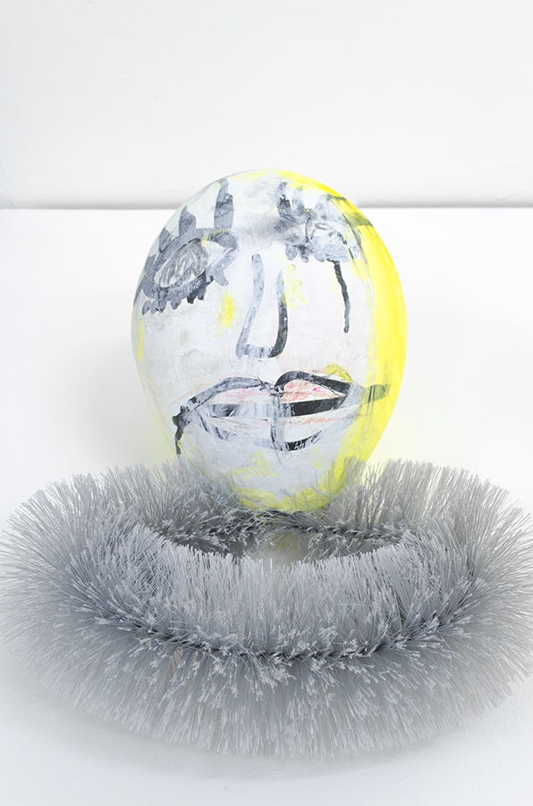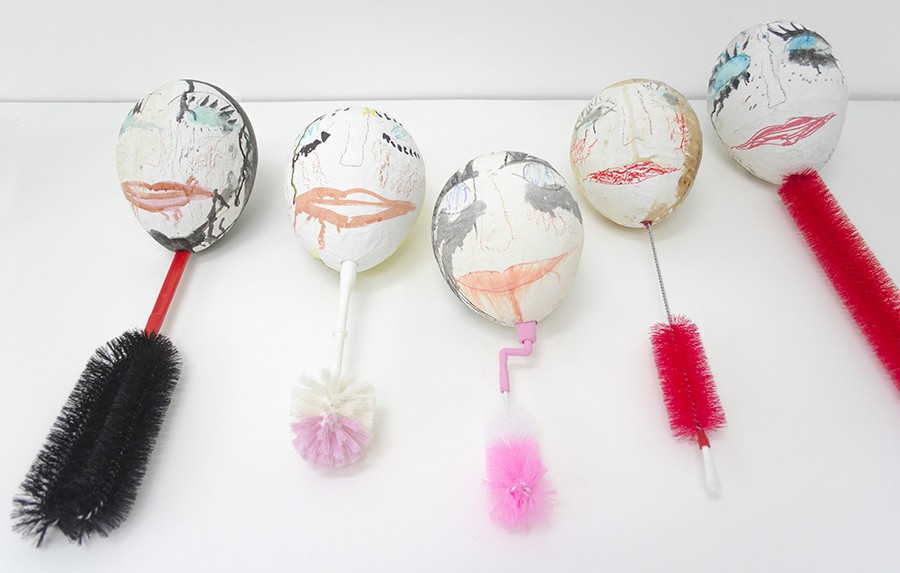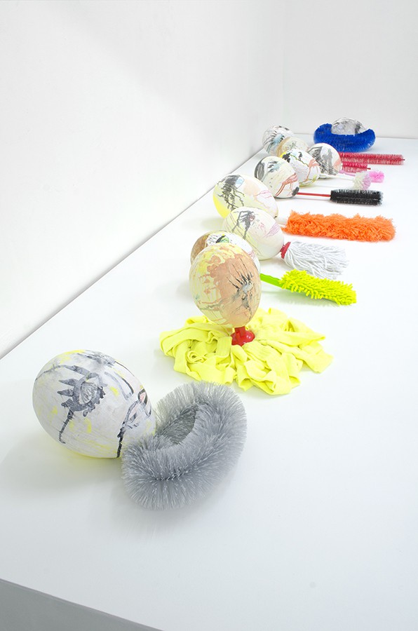 Ding dong in the mirror, 2015, acrylic, marker, ink, crayon, pencil, oil pastel on papier-mâché, various household cleaning tools, 305 x 100 x 40cm.