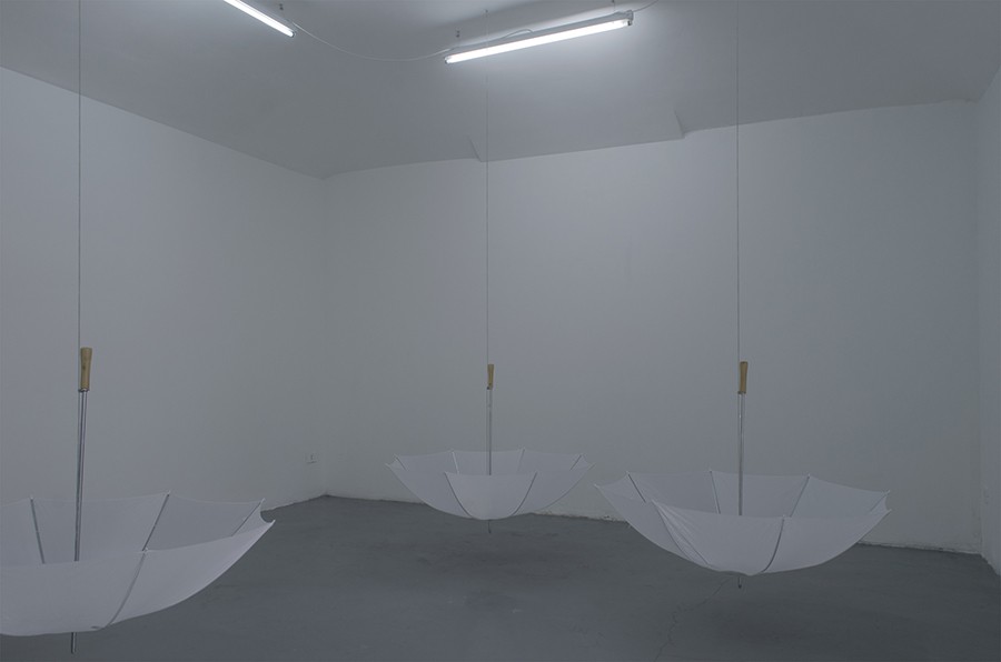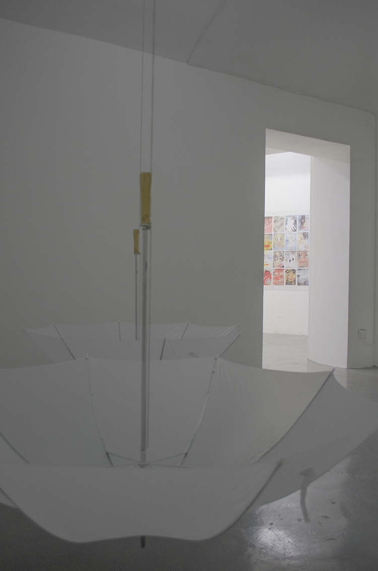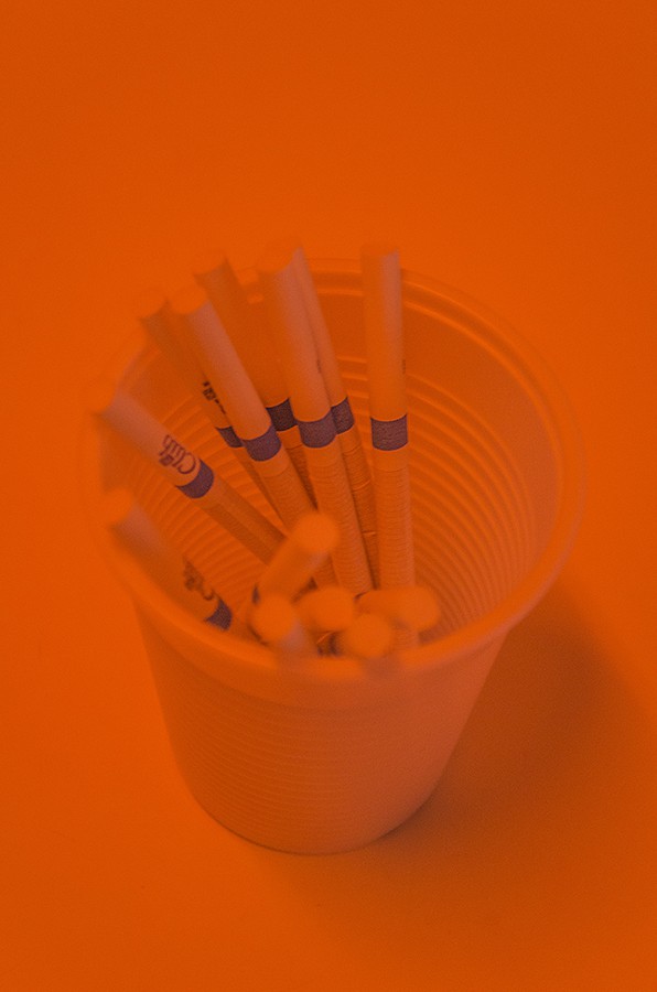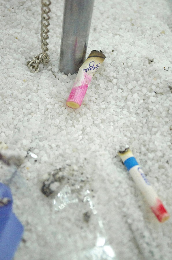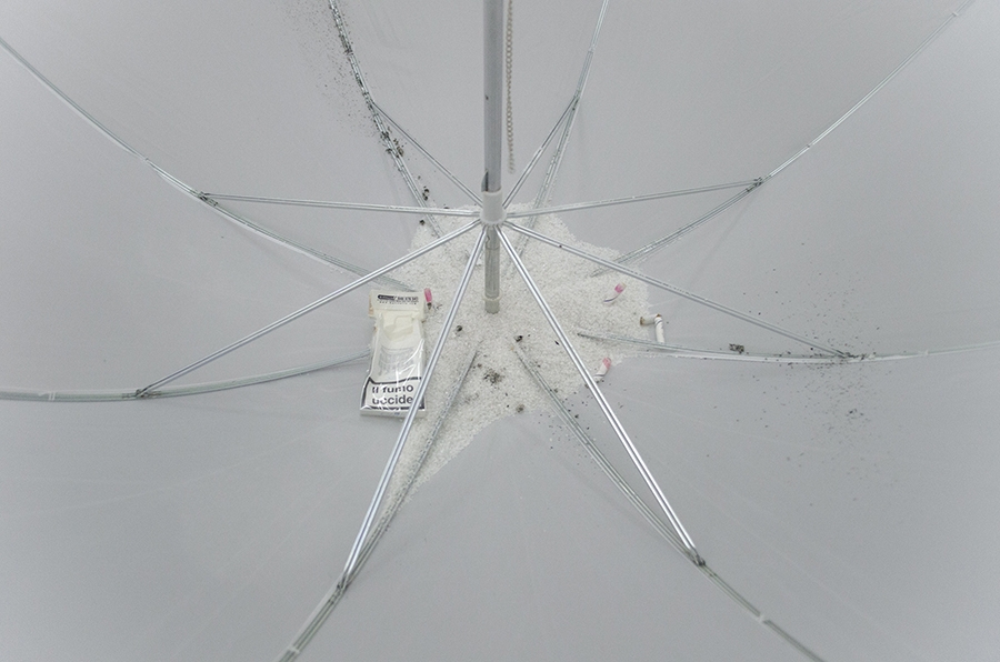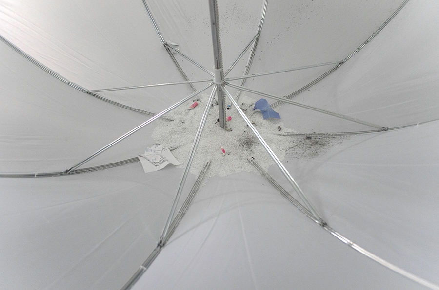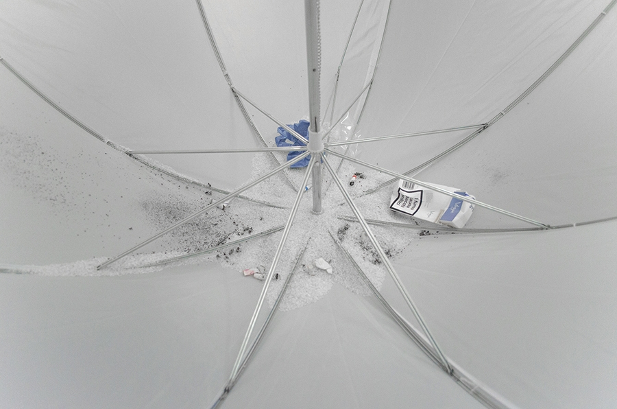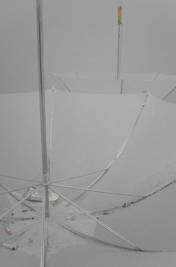 Old weather, 2015, umbrellas, cigarettes, lipstick, gravel.