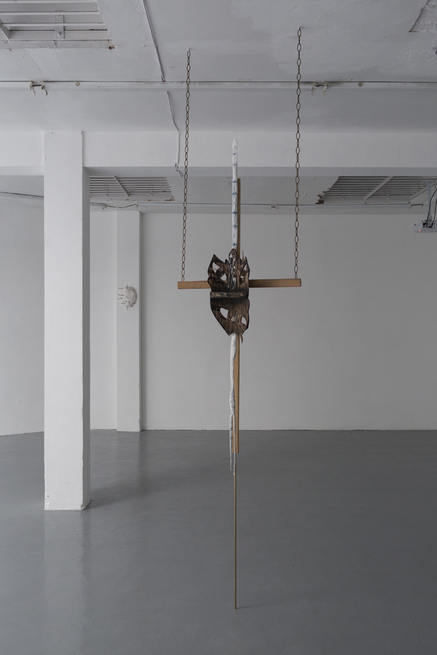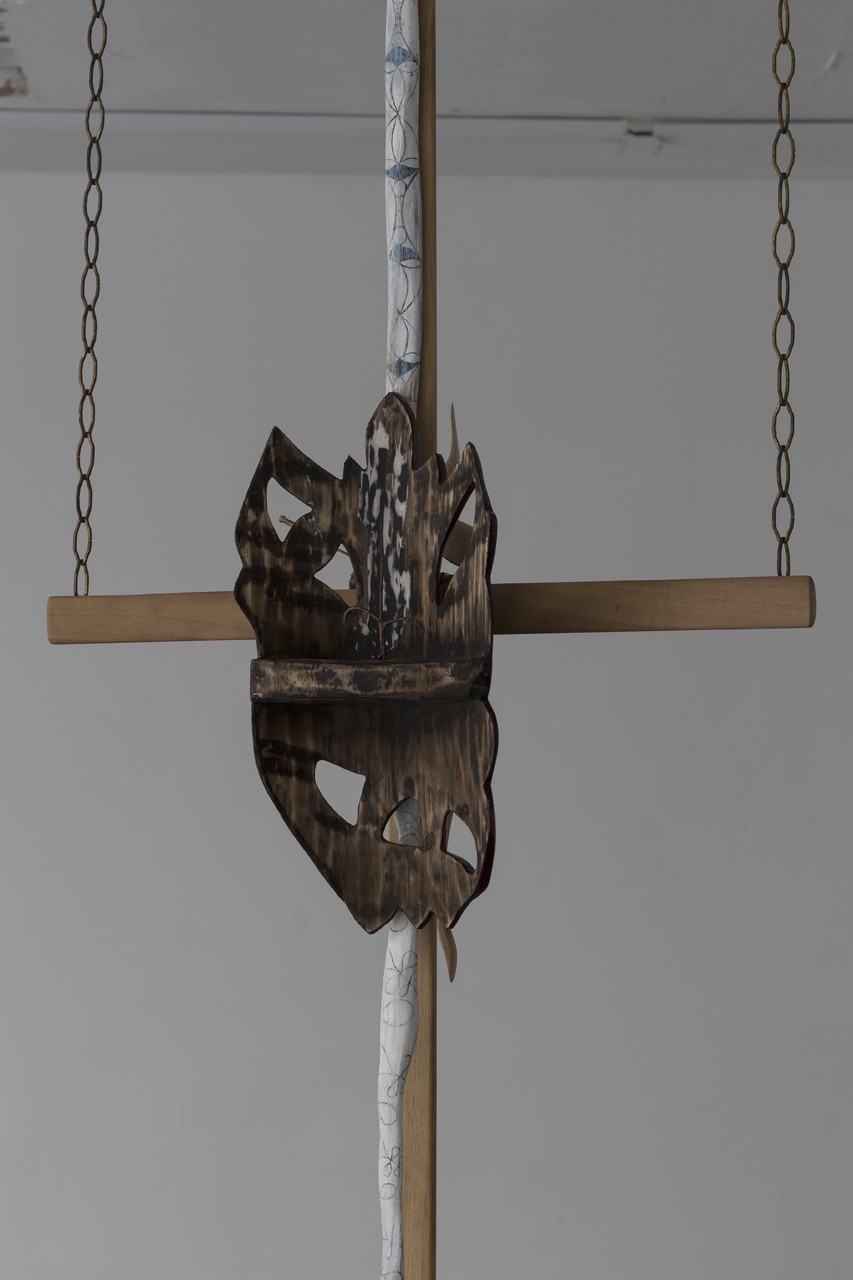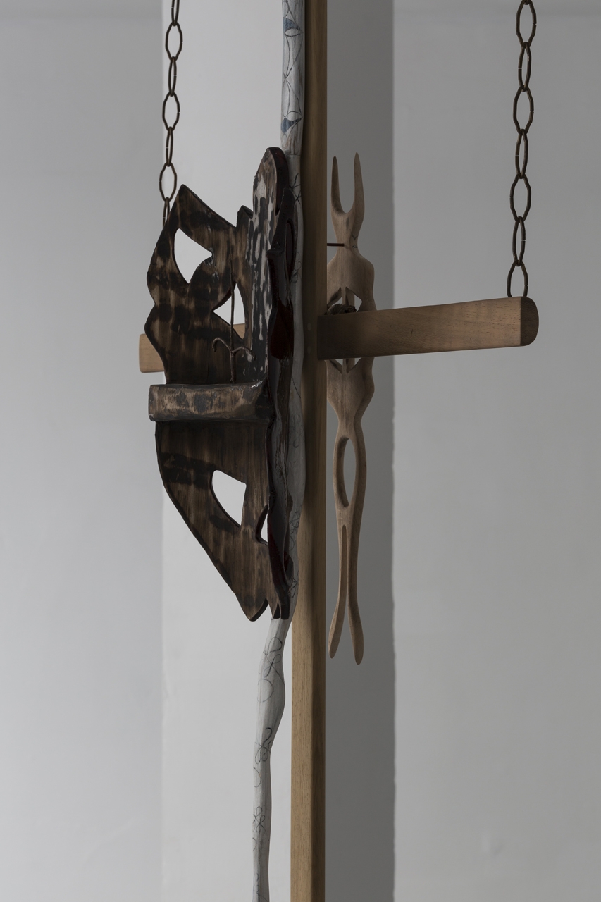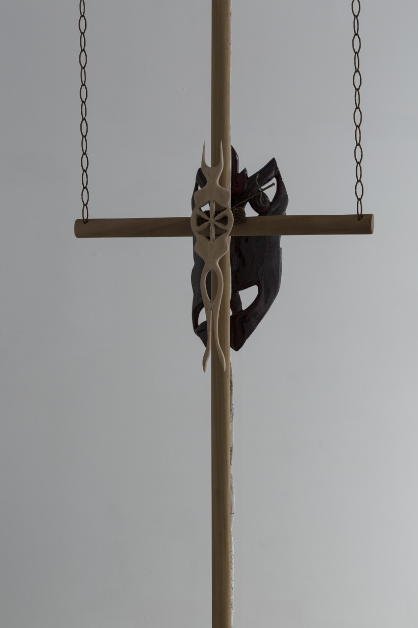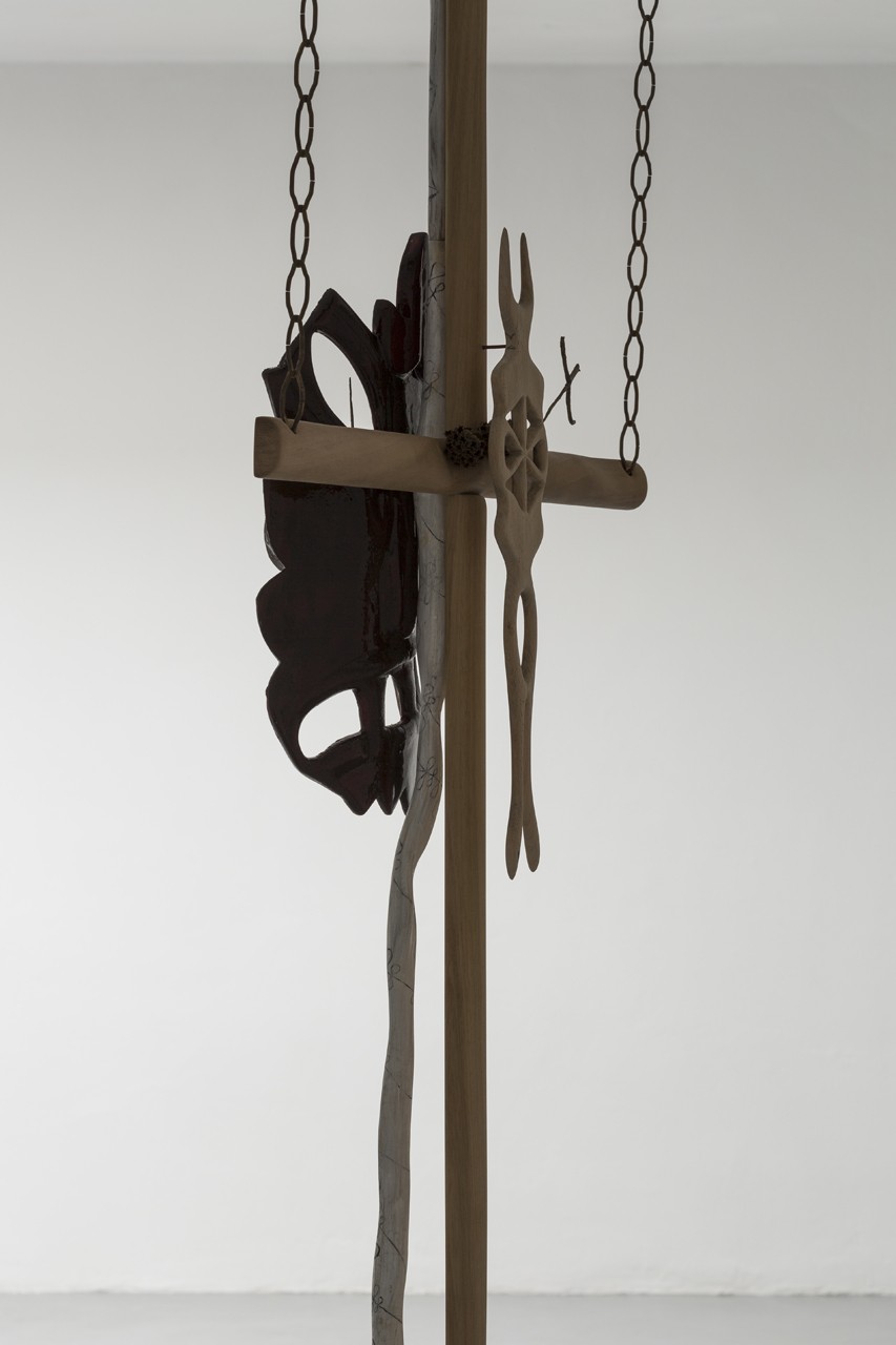 Wheel of a Dyspeptic Convulsion, 2018. Wood, bronze, brass, oil paint, dried flowers, dragon’s blood powder, epoxy resin. 311 x 73 x 22 cm