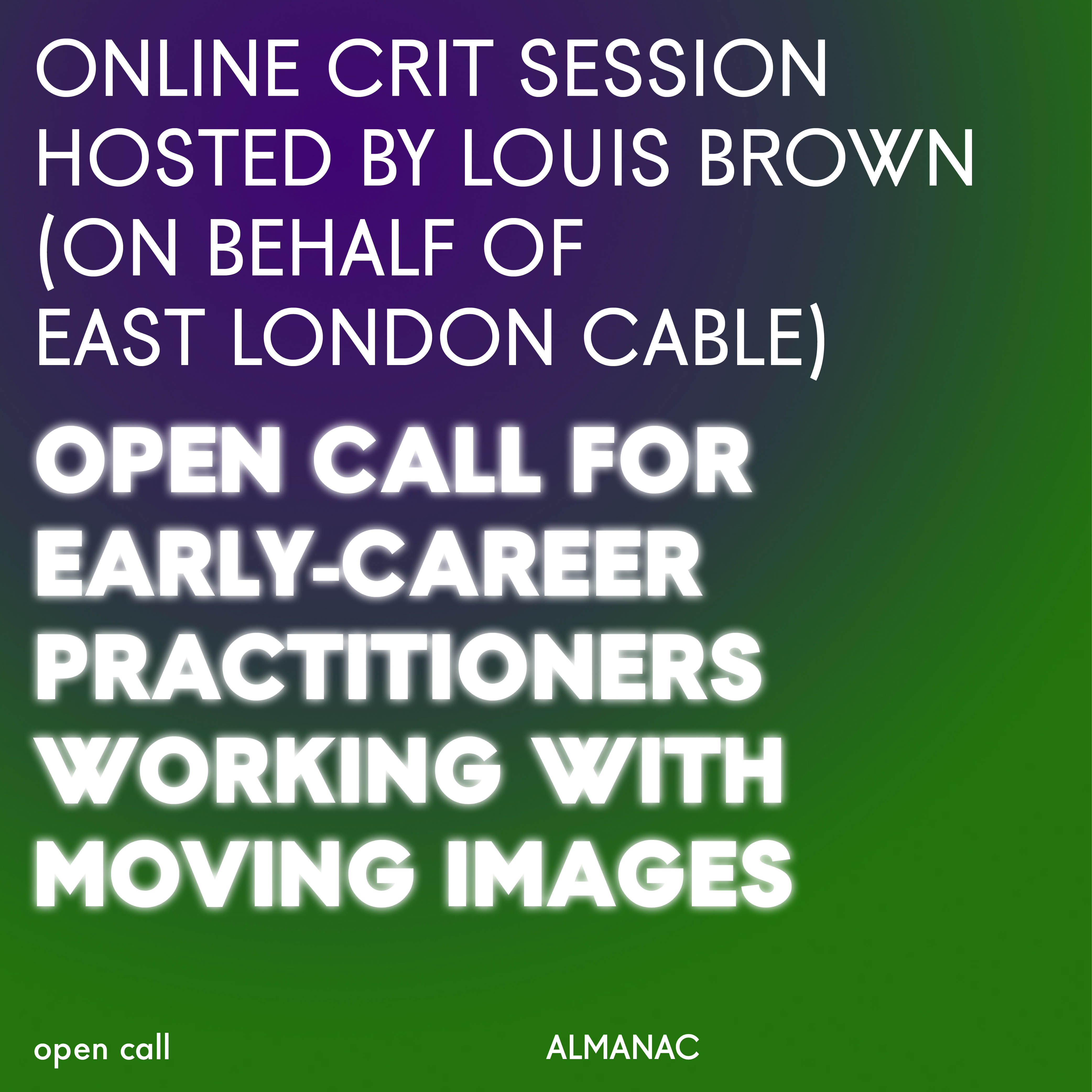 Almanac Projects is organising an online crit session to be offered to early-career practitioners working with moving images. The crit session will be hosted by artist and filmmaker Louis Brown (on behalf of East London Cable) (https://elc.vision/) and is meant as a peer-to-peer opportunity to receive feedback on a work, whether in progress or already realised.