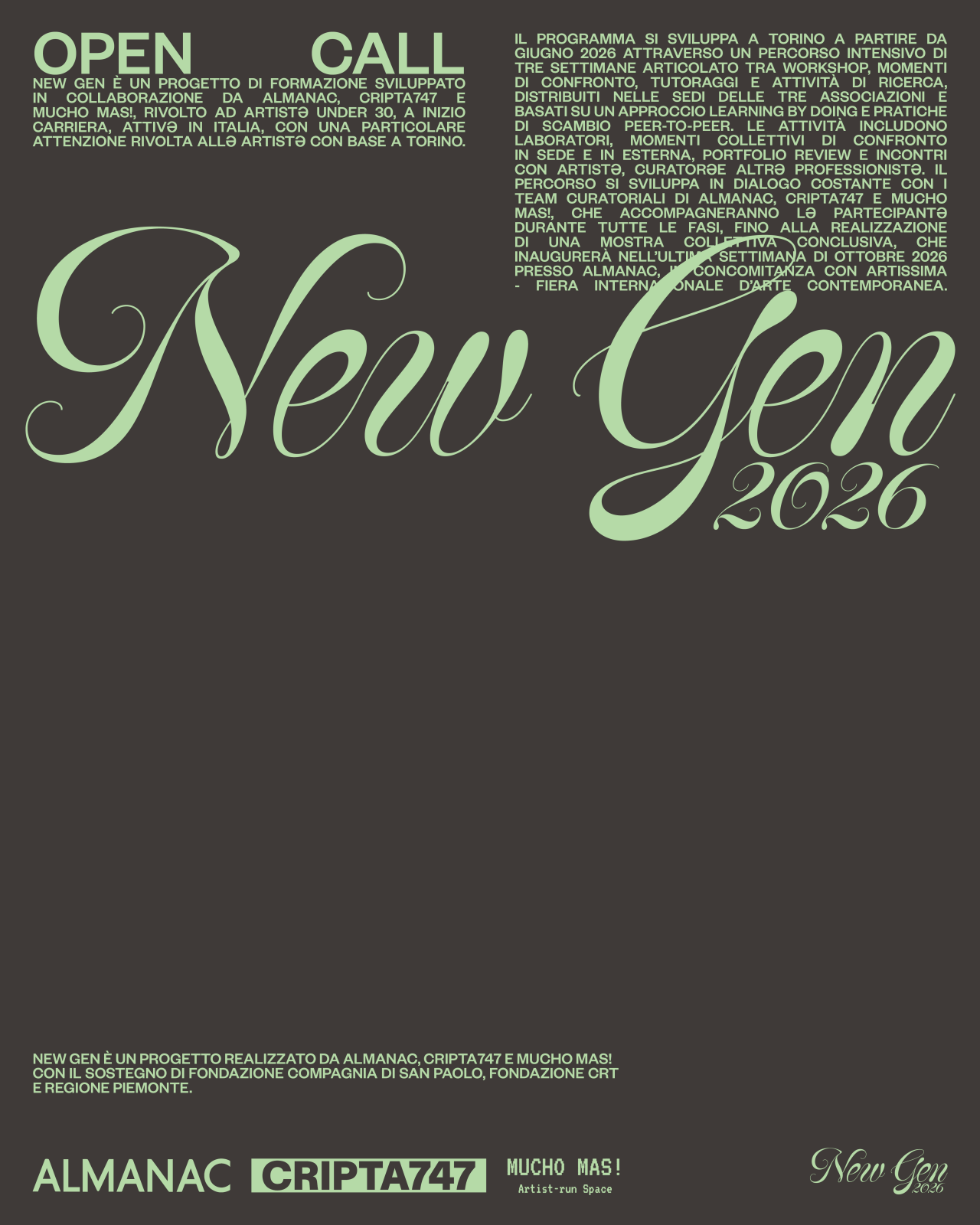 New Gen is a training program developed in collaboration by Almanac, Cripta747, and Mucho Mas!, aimed at artists under 30 who are at the beginning of their careers and active in Italy, with particular attention given to artists based in Turin.